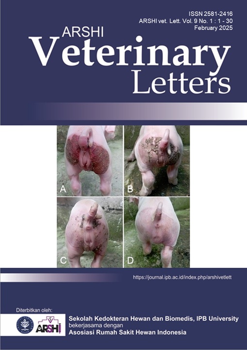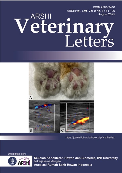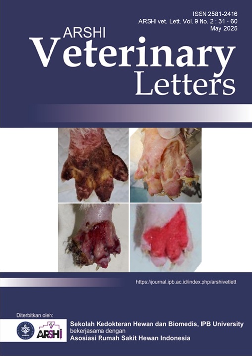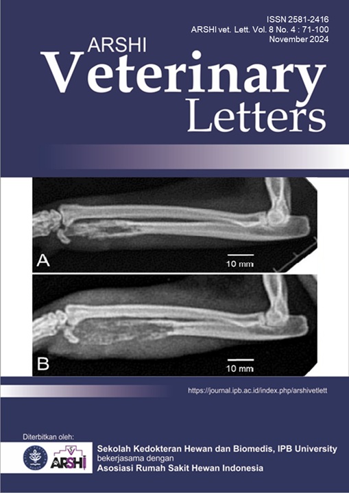ARSHI Veterinary Letters (ARSHI Vet Lett) (e-ISSN: 2581-2416) is an open-access, peer-reviewed journal published four times a year (February, May, August, and November) by the School of Veterinary Medicine and Biomedical Sciences, IPB University—formerly the Faculty of Veterinary Medicine (Rector Letter No. 328)—in collaboration with the Indonesian Veterinary Hospital Association (ARSHI). Established in 2017 and accredited SINTA 4 (Decree No. 79/E/KPT/2023, May 11, 2023), the journal focuses on clinical case–driven and practitioner-oriented studies in veterinary medicine. It aims to disseminate clinically relevant veterinary knowledge through case-based research, diagnostic innovations, and applied biomedical findings that bridge academic research and daily veterinary practice. ARSHI Vet Lett welcomes submissions covering not limited to case reports, clinical studies, diagnostic imaging, pathology, pharmacology, reproduction, zoonotic diseases, and biomedical innovations. All articles published in ARSHI Vet Lett has been indexed in: Crossreff, WorldCat, Scilit, Dimension, EBSCO, LensScholar, Garuda, Google Scholar, Microsoft Academia, and being process for other directory of research journal index
