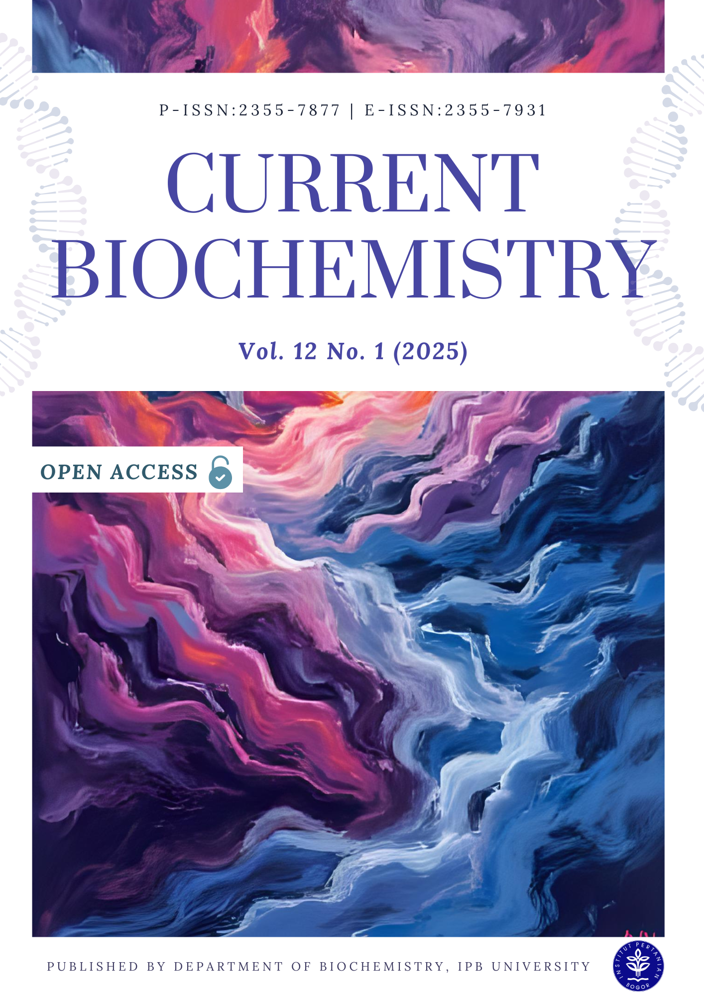 Current Biochemistry (CB) journal published by Department of Biochemistry, IPB University collaborate with Indonesian Society of Biochemistry and Molecular Biology (Bogor chapter). Current Biochemistry (CB) first published articles (Volume 1) in 2014 three times a year: April, August, and December. Starting Volume 6 (2019) Current Biochemistry accredited SINTA 5 and published two times a year: June and December. This journal provides immediate open access to its content on the principle that making research freely available to the public supports a greater global exchange of knowledge. Article processing charge is covered by Department of Biochemistry, Bogor Agricultural University. Authors do not have to pay APC.
