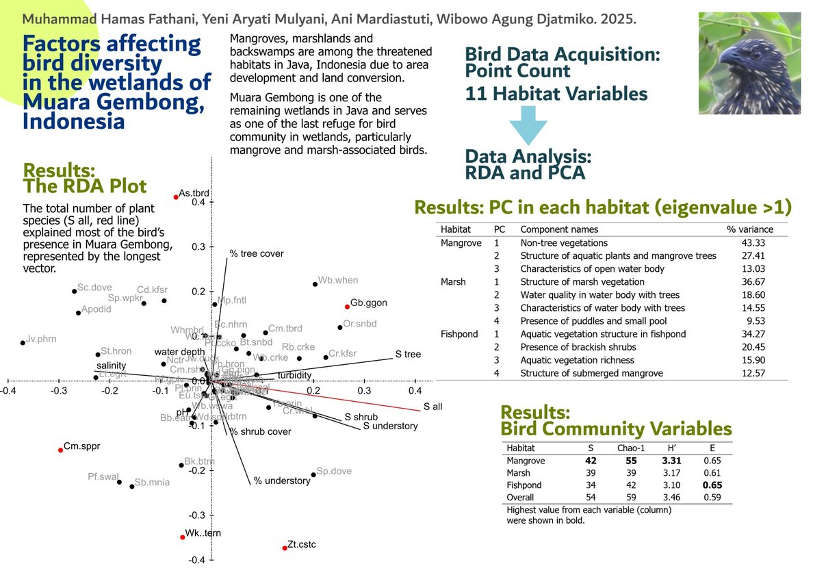 Marshlands and backswamps are among the threatened habitats in Indonesia, along with mangroves, particularly in Java due to area development and land conversion. Muara Gembong is one of the remaining wetlands in Java and serves as one of the last refuges for the bird community in wetlands, particularly mangrove and marsh-associated birds. We observed bird communities and collected eleven habitat variables in three habitats, namely mangrove, marsh, and fishpond, to see which variable affects bird abundance and diversity most. We found out that the total number of plant species, along with the number of tree, understory, and shrub species, were the strongest factors affecting bird diversity in Muara Gembong. Separate analysis in each habitat, however, reveals that different abiotic factors also strongly correlate with bird diversity. Vegetation correlates strongly with bird diversity in mangroves and marshes, while pH and turbidity play a strong role in bird diversity in fishponds.