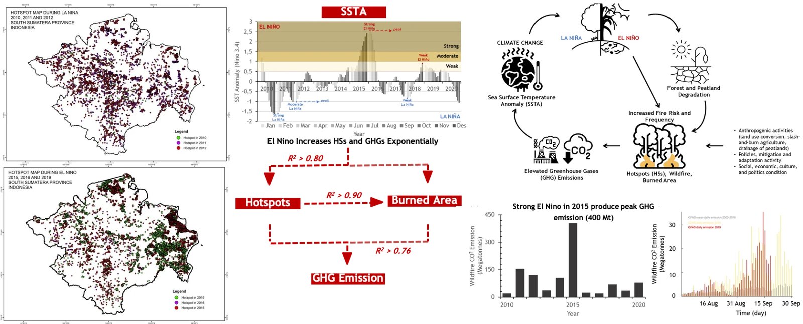 South Sumatra Province has characteristics that significantly increase hotspots and produce greenhouse gas (GHG) emissions in strong El Niño phenomena. This study investigates the impact of forest fires on GHG emissions during extreme climate in the South Sumatra Province from 2010 to 2020. This research analyzes the effects of La Niña and El Niño on the region by analyzing factors such as precipitation patterns, temperature fluctuations, hotspots, and greenhouse gas emissions. This study indicates that forest fires mostly happen during the dry season (May to October). El Niño occurred for the second time in 2015-2016 and 2018-2019, which affected the highest fire (hotspots, HSs) during the strong El Niño. Meanwhile, La Niña occurred three times in 2010-2011, 2011-2012, and 2017-2018, which is related to the low HSs found and represents the highest annual rainfall in the last ten years. The highest forest fire (HSs = 17.559) occurs in the characteristics of A1-B4 (precipitation 0-100, SSTA > 0.5°C). The highest GHG emission (>400 Mton) occurred in 2015 when the strong El Niño occurred in South Sumatra Province. The strong and weak El Niño produces the highest GHG emissions of more than 30 megatons per day, while the maximum mean daily GHG emission is under 10 megatons per day. Hotspot numbers rise exponentially with increasing SSTA, showing strong statistical relationships (R² > 0.80, r > 0.79) with burned area (R² = 0.90, r = 0.92) and burned area with CO₂ emissions (R² = 0.77, r = 0.79).