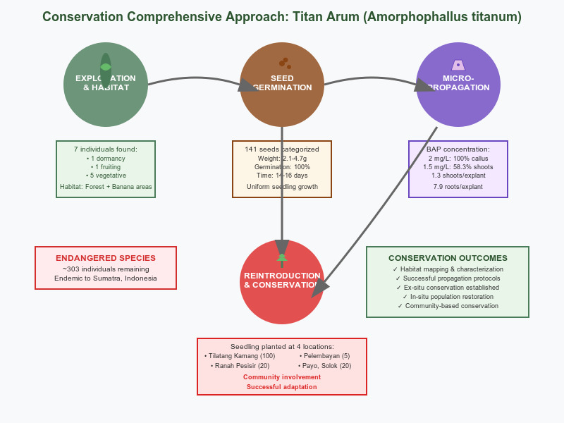 Conservation Comprehensive Approach: Study on Exploration, Habitat Analysis, Propagation, and Reintroduction of the Indonesian Endemic Endangered Titan Arum (Amorphophallus titanum Becc.)