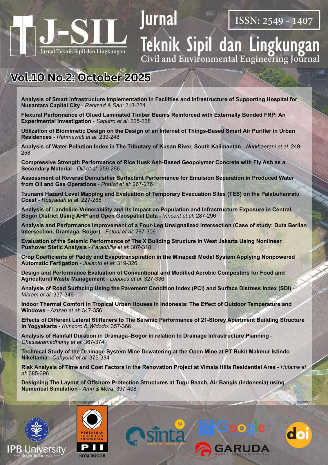 Design and Performance Evaluation of Conventional and Modified Aerobic Composters for Food and Agricultural Waste Management Rasendriya Arkananta Bhanu Loppies , Joana Febrita , Chusnul Arif Page : 327-336 DOI : 10.29244/jsil.10.2.327-336 Abstract View : 53 12. PDF downloads: 48 12. PDF Analysis of Road Surfacing Using the Pavement Condition Index (PCI) and Surface Distress Index (SDI) Dio Vikram , Erizal , Apriadi Page : 337-346 DOI : 10.29244/jsil.10.2.337-346 Abstract View : 79 13. PDF downloads: 72 13. PDF Indoor Thermal Comfort in Tropical Urban Houses in Indonesia: The Effect of Outdoor Temperature and Windows Jihan Nur Azizah , Joana Febrita , Yudi Chadirin Page : 347-356 DOI : 10.29244/jsil.10.2.347-356 Abstract View : 111 14. PDF downloads: 79 14. PDF Effects of Different Lateral Stiffeners to The Seismic Performance of 21-Storey Apartment Building Structure in Yogyakarta Ardityo Dwi Kuncoro , Slamet Widodo Page : 357-366 DOI : 10.29244/jsil.10.2.357-366 Abstract View : 84 15. PDF downloads: 61 15. PDF Analysis of Rainfall Duration in Dramaga–Bogor in relation to Drainage Infrastructure Planning Shaffadina Putry Chessaramadhanty , Asep Sapei , Rakhmat Prasetia Page : 367-374 DOI : 10.29244/jsil.10.2.367-374 Abstract View : 62 16. PDF downloads: 70 16. PDF Technical Study of the Drainage System Mine Dewatering at the Open Mine at PT Bukit Makmur Istindo Nikeltama Yudho Dwi Galih Cahyono , Avellyn Shinthya Sari , Maudy Cheisylia Sikopa , Regina Warayaan Page : 375-384 DOI : 10.29244/jsil.10.2.375-384 Abstract View : 63 17. PDF downloads: 74 17. PDF Risk Analysis of Time and Cost Factors in the Renovation Project at Vimala Hills Residential Area Vigie Priantika Putra Hutama , Erizal , Satyanto Krido Saptomo , Naufal Rudini Page : 385-396 DOI : 10.29244/jsil.10.2.385-396 Abstract View : 50 18. PDF downloads: 50 18. PDF Designing the Layout of Offshore Protection Structures at Tugu Beach, Air Bangis (Indonesia) using Numerical Simulation Afdhal Amri , Mas Mera Page : 397-408 DOI : 10.29244/jsil.10.2.397-408 Abstract View : 71 19. PDF downloads: 62 19. PDF