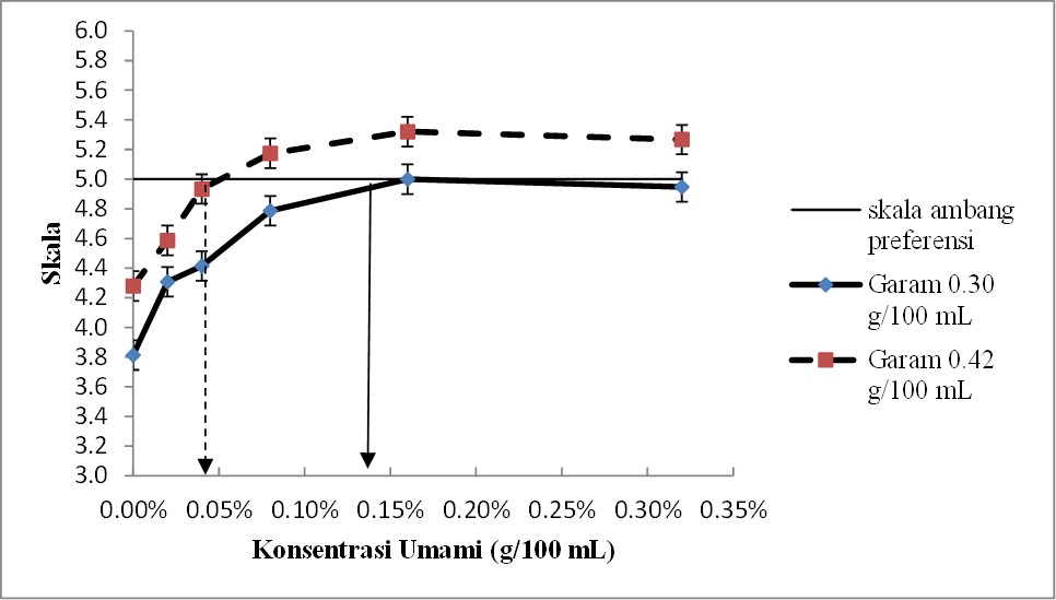 Umami is one of the basic taste produced by monosodium glutamate (MSG). Generally, commercial MSG products did not specify the amount of a certain dose to produce palatable food. This problem could lead to uncontrolled and excessive use of MSG by consumers. The aim of this study was to determine the values for the detection and preference threshold of umami taste from commercial MSG products at different salt level. The detection threshold was determined using R-index method in salt solutions. The preference threshold was determined by using hedonic rating in food model. A food model selected in this case is spinach soup that is commonly consumed by Indonesian. The salt concentrations for detection and preference threshold experiment were 0.42 and 0.30 g/100 mL. Umami taste preference threshold value using Fechner’s psychophysic equation for 0.30 g/100 mL salt concentration is 0.25 g MSG/100 mL, while for 0.42 g/100 mL salt concentration, the umami taste preference threshold value is 0.06 g MSG/100 mL. Detection threshold value using R-index method for 0.30 g/100 mL salt concentration is 0.05 g MSG/100 mL, while for 0.42 g/100 mL salt concentration is 0.02 g MSG/100 mL. Different salt concentrations leads to differences in the values of threshold preferences and detection threshold of the umami taste of MSG. Increasing salt concentration tends to decrease the detection and preference threshold of umami taste from MSG. This research results could be used as the basic information in food product formulation such as seasoning and condiment using mixtures of salt and MSG.