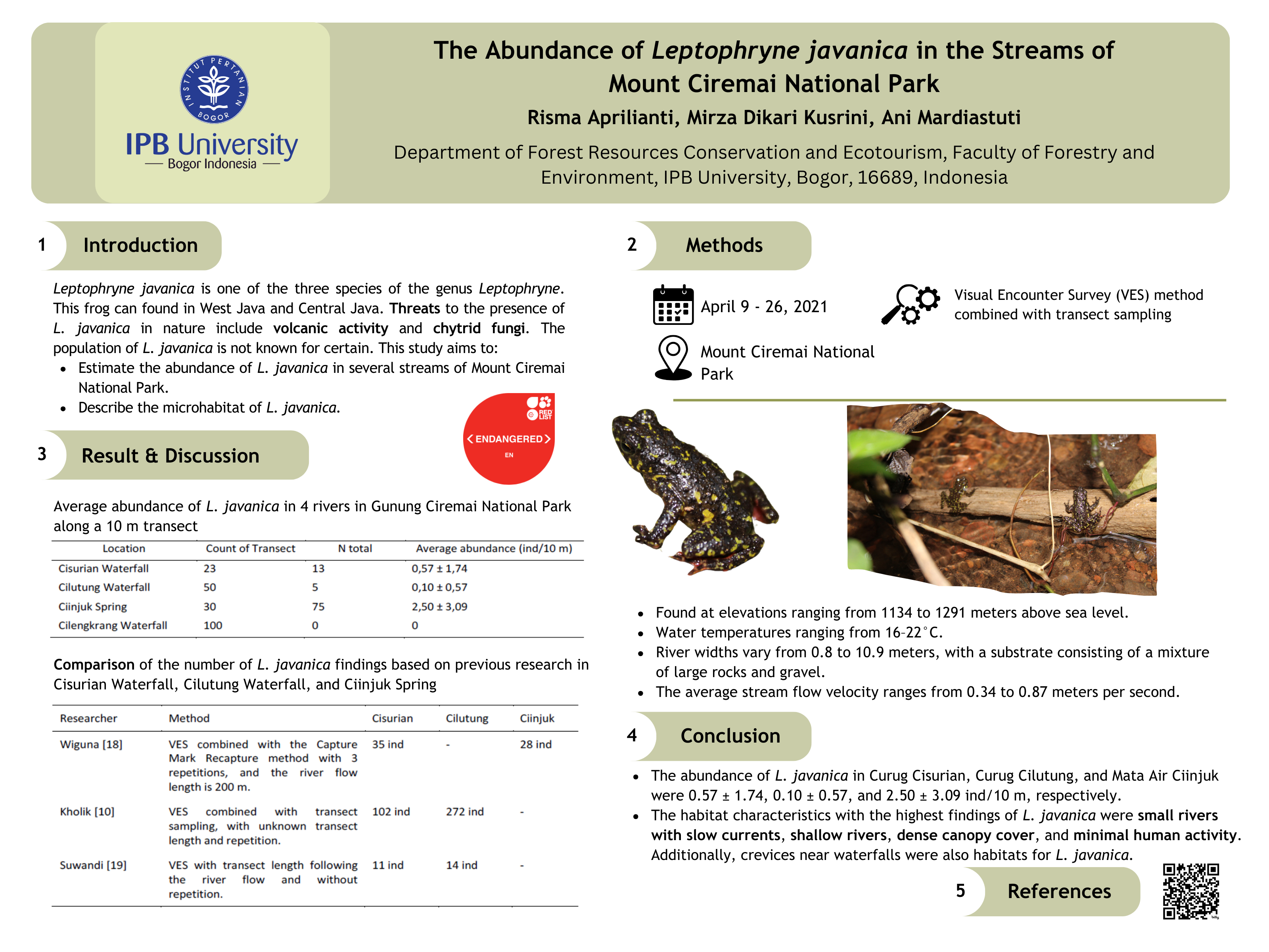 20. Yazid, M. (IPB University, Bogor, Indonesia). Laporan Akhir Monitoring Kodok Merah (Leptophryne cruentata Tschudi, 1838) di Taman Nasional Gunung Gede Pangrango, Jawa Barat, Indonesia, Unpublished work, 2007.