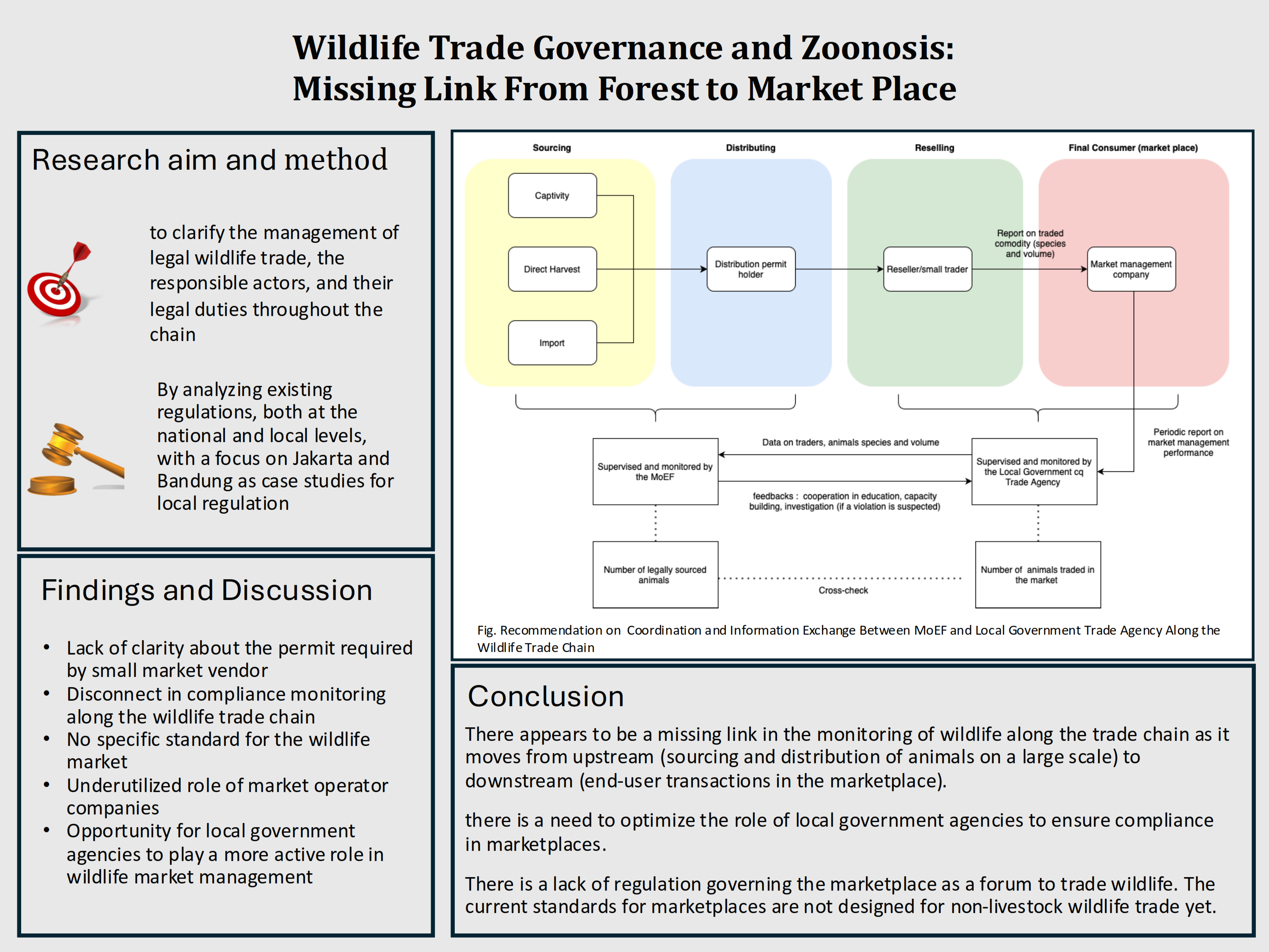 Indonesia is a major hub for domestic and international wildlife trade. Illegal and unregulated trade threatens species survival and public health through potential zoonotic disease transmission. Effective governance, including strengthened legislation and enforcement, is essential to address these issues. This paper scrutinizes the laws and policies governing wildlife trade and zoonosis prevention in Indonesia, spotlighting the regulatory path from source to marketplace transactions. By analyzing existing regulations, both at the national and local levels, with a focus on Jakarta and Bandung as case studies for local regulation, this study aims to clarify the management of legal wildlife trade, the responsible actors, and their legal duties throughout the chain. The findings underscore a disconnect exists between upstream monitoring and downstream marketplace activities. Furthermore, the discussion reveals a critical regulatory loophole- the lack of regulations addressing standards for a healthy non-livestock wildlife market and the often-overlooked role of local government agencies, which, despite playing a marginalized role in wildlife trade monitoring strategies, are the forefront of zoonosis surveillance and monitoring duty.